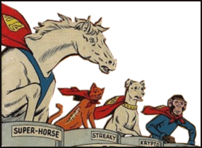 На втором месте Легион суперживотных. Представители животного мира помогали Супермену в нужный момент. Суперпес, например, участвовал в боях со своим хозяином. Мартышка должна была помочь с ремонтом техники героя. Суперкошка Стрики получила способности благодаря излучению криптонита. Суперлошадь Комета - на самом деле заколдованный кентавр из Древней Греции по имени Бирон. Бирона хотели сделать человеком, но заклинание было неудачным. Зато он получил бессмертие и суперспособности. Человеческий облик Суперлошадь может обрести раз в год, когда мимо Земли пролетает комета.