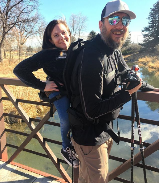 "Мелани - пушинка, - смеется Тревор. - У нас специальный рюкзачок-кресло, она садится в него, я надеваю рюкзак на спину и ношу любимую".