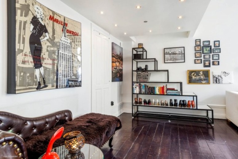 Этажерка в углу является одновременно и лестницей, ведущей на второй уровень, где расположено спальное место, чтобы увеличить жилую площадь.