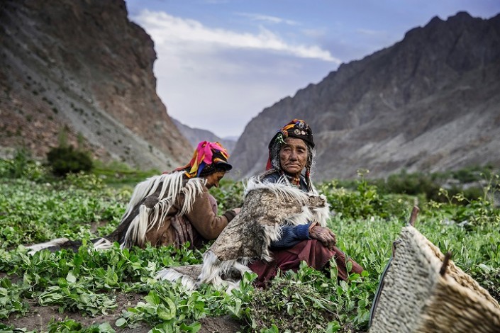 Пожилые ладакхские женщины работают на поле высоко в горах. Они выращивают овощи на продажу на местном рынке в Ладакхе, на севере Индии.