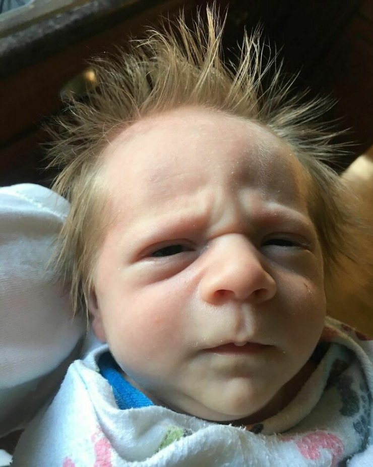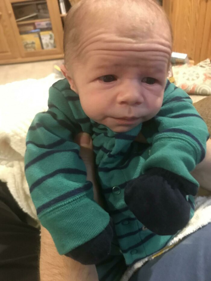 #5 "Моему сыну всего неделя, но морщины на лбу говорят о том, что он 80-летний дед, который засыпает в кресле за просмотром телевизора"
