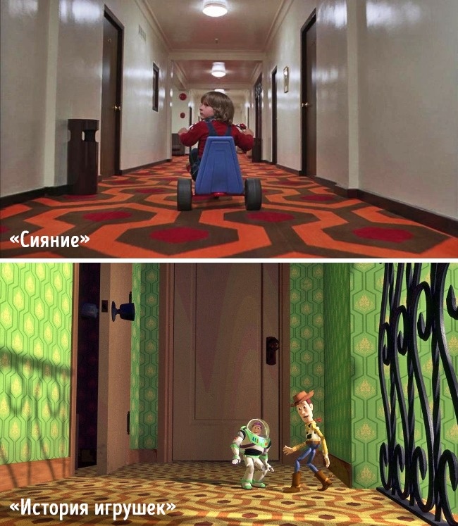 Ковер перед комнатой Сида в мультфильме "История игрушек" в точности повторяет ковровое покрытие в одном из коридоров отеля "Оверлук" в фильме "Сияние". Именно того коридора, в котором герой Джека Николсона пытается убить топором жену и сына.