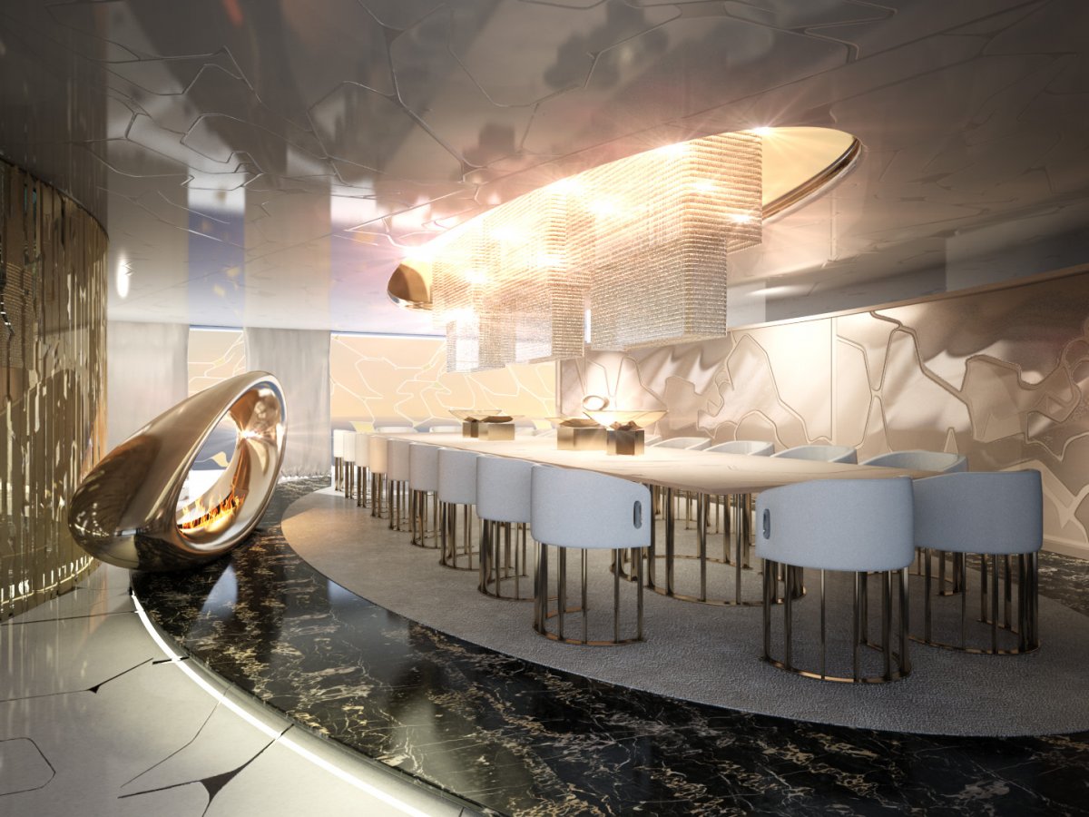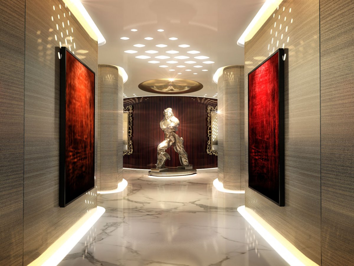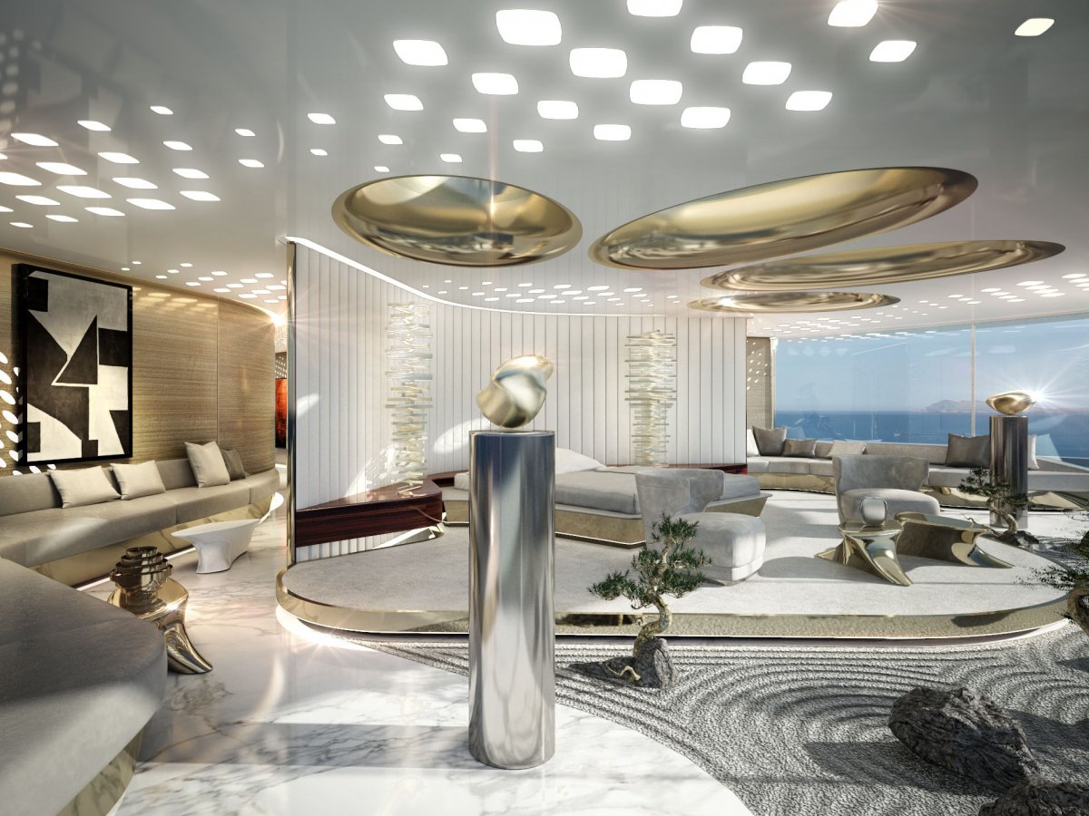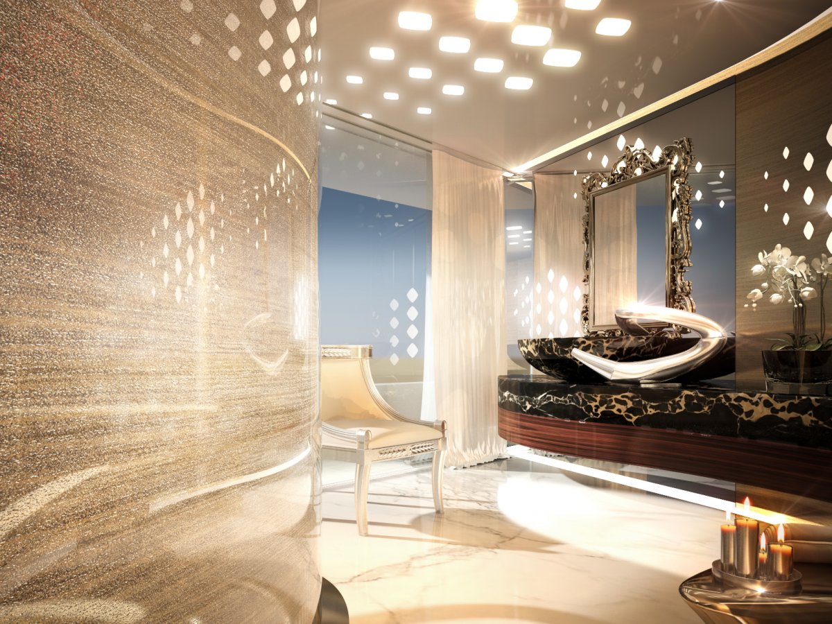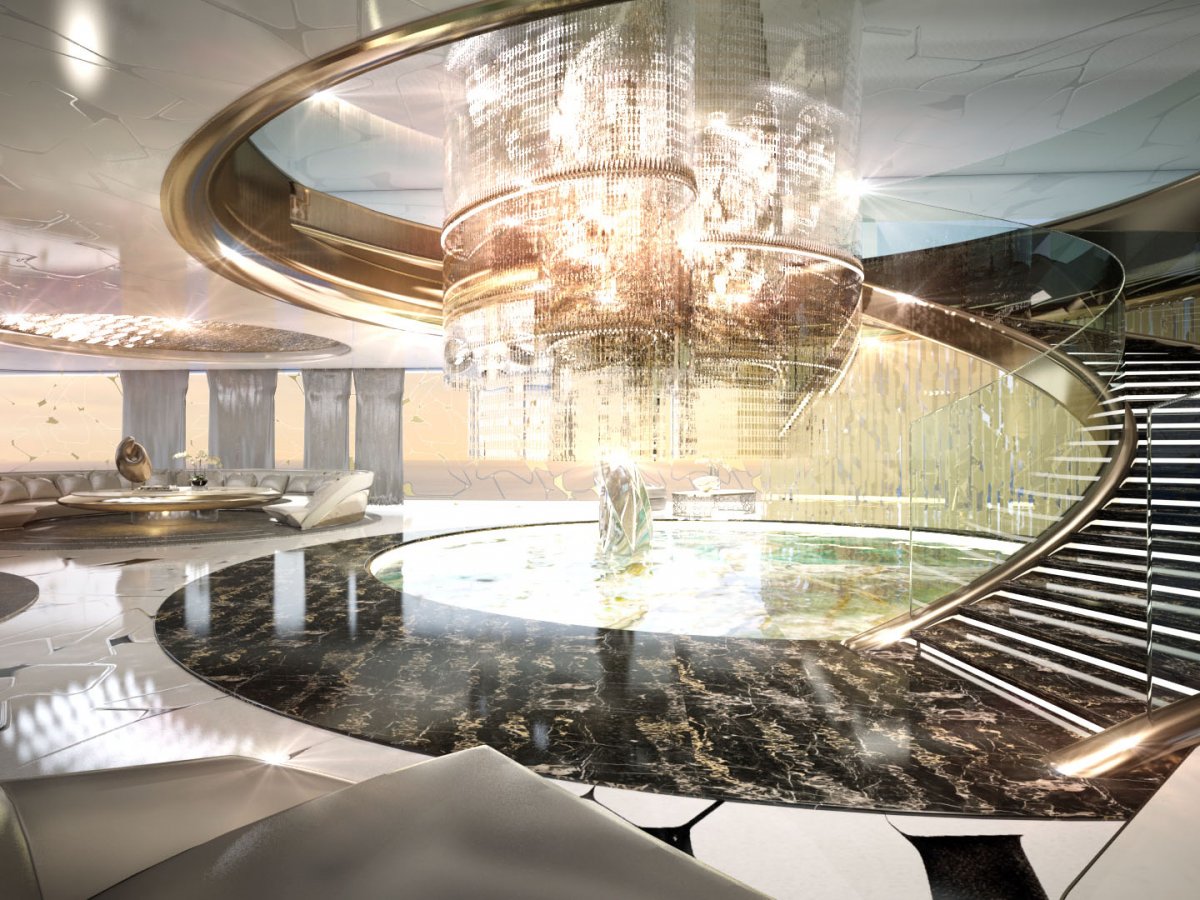 Это не просто большое судно, это новый концепт компании Italian Sea Group. Шикарные интерьеры яхты подчеркнуты грандиозной хрустальной люстрой, проходящей сквозь палубы, и мраморными полами.