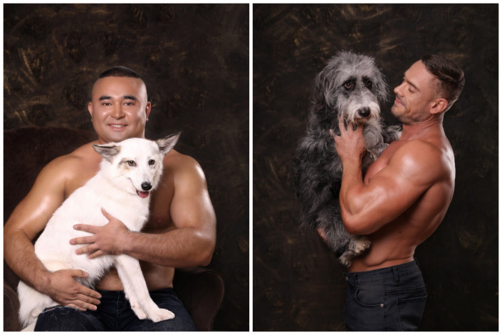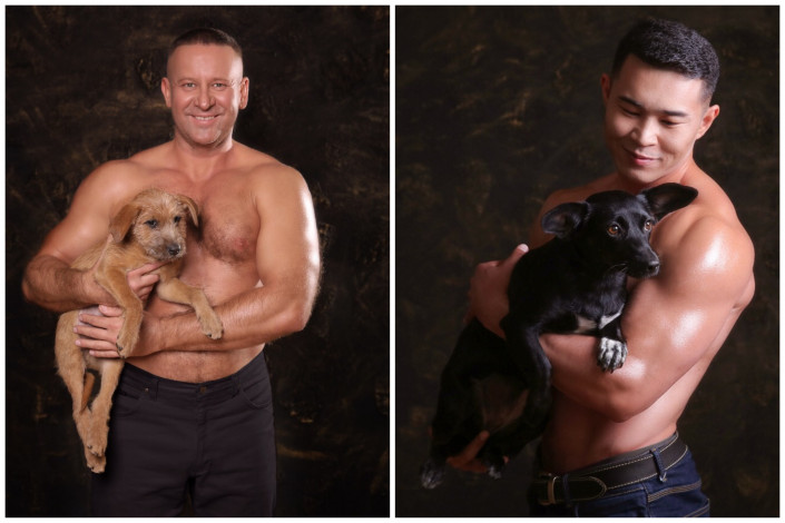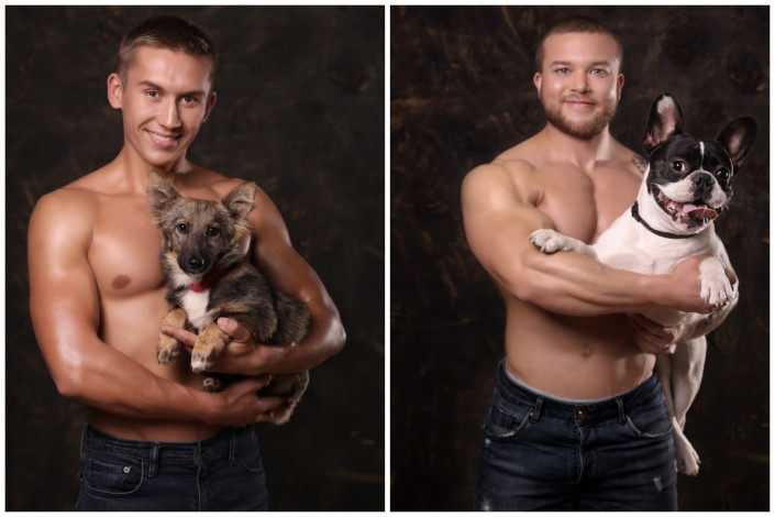 12 волонтеров, среди которых бодибилдеры, пауэрлифтер и ветеринар, с радостью приняли участие в фотосессии. Они фотографировались с собаками из приютов.