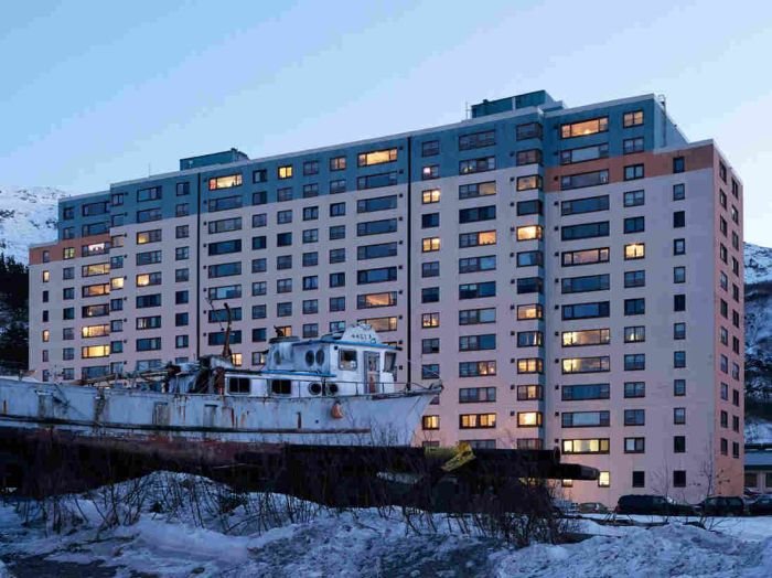Погода в этом уголке Аляски очень изменчивая - ветра дуют со скоростью до 60 миль в час, а снегопад доходит до 250 дюймов. Так что на самом деле то, что жители города живут под одной крышей, имеет смысл.