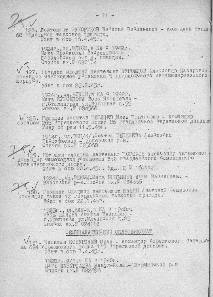 В информационной базе данных Министерства обороны России "Память народа" Конурбаев Ораз числится как капитан, командир стрелкового батальона 643-го стрелкового полка, 119-й стрелковой дивизии. Конурбаев Ораз родом из села Никольского Жарминского района Семипалатинской области, окончил 10 классов и в 1940 году в возрасте 17 лет был призван на фронт.