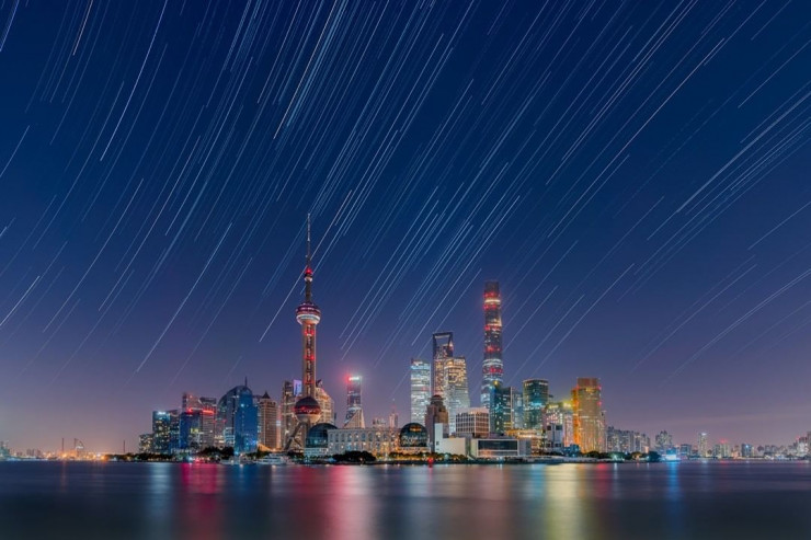Звездные следы над горизонтом, район Пудун в Шанхае, Китай.