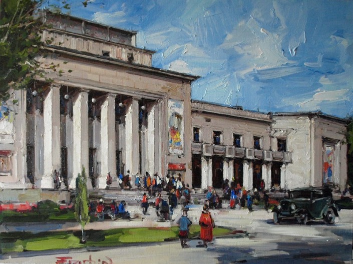 "Здесь частично представлены работы, сделанные на основе архивных материалов, переведенные в цвет и с попыткой воссоздать и живописной техникой, и колористической атмосферу середины прошлого века. Мне по натуре близок исторический подход. Я антиквар в душе. Мне очень нравится старая Алма-Ата. Она построена в 30-е годы по центральному генплану, моя родина - северный Павлодар, он построен так же, но только на 25 лет позднее. Эта эпоха оставила яркий след в архитектуре. Многие сооружения не сохранились в таком варианте, который был бы привлекателен, либо их просто нет. Существуют архивные фотографии, здания, которых уже нет, как, например, кинотеатр "Алатау". Это первый кинотеатр, конец 40-х годов. Хочется передать ту атмосферу живописным способом. Не только передать изображение объекта, который был и которого уже нет, а эмоционально войти в воздух того времени", - рассказывает художник.