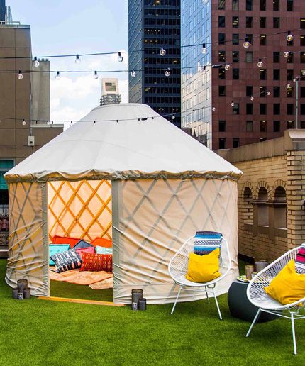 Юрта расположена на террасе в оживленной части города, но, по словам дизайнера Кимберли Винтроп, уникальная конструкция имеет хорошую звукоизоляцию и звуки проезжающих машин не помешают гостям выспаться.