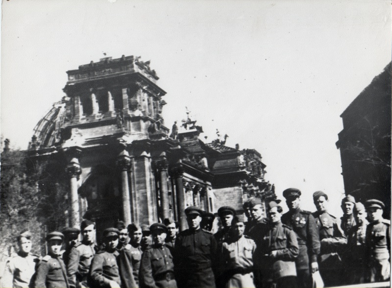 Советские фотожурналисты и кинооператоры у здания Рейхстага. Слева на право, первый ряд: Г. Самсонов, А. Морозов, Ф. Кислов, Л. Железнов, И. Шагин, О. Кнорринг; второй ряд: С. Альперин, А. Капустянский, Г. Петрусов, Р. Кармен; третий ряд: А. Архипов, М. Редькин.