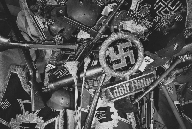 Груда советских трофеев - символ разгрома гитлеровской Германии. Винтовки, пистолет-пулемет MP-40, пулемет, награды и знамена. В центре - штандарт дивизии СС "Лейбштандарт СС Адольфа Гитлера".