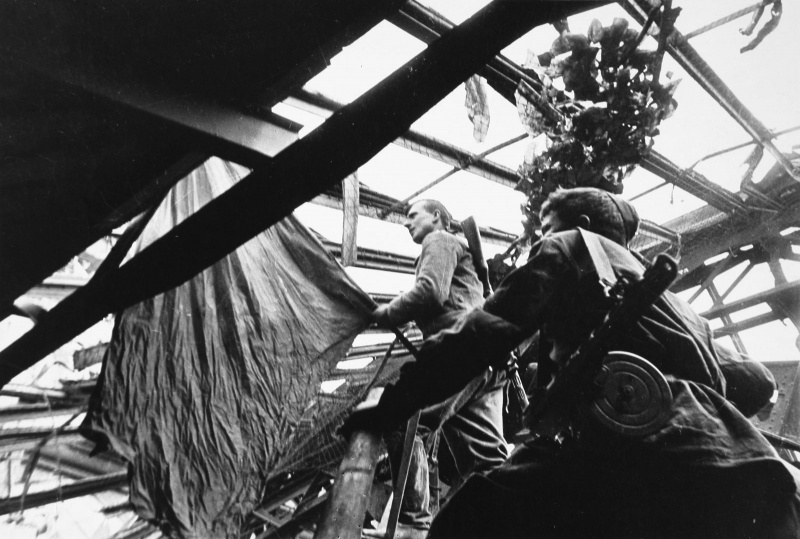 Михаил Егоров и Мелитон Кантария выходят со знаменем на крышу Рейхстага. Хотя это было не первое установленное на Рейхстаге красное знамя, но именно его считают Знаменем Победы.