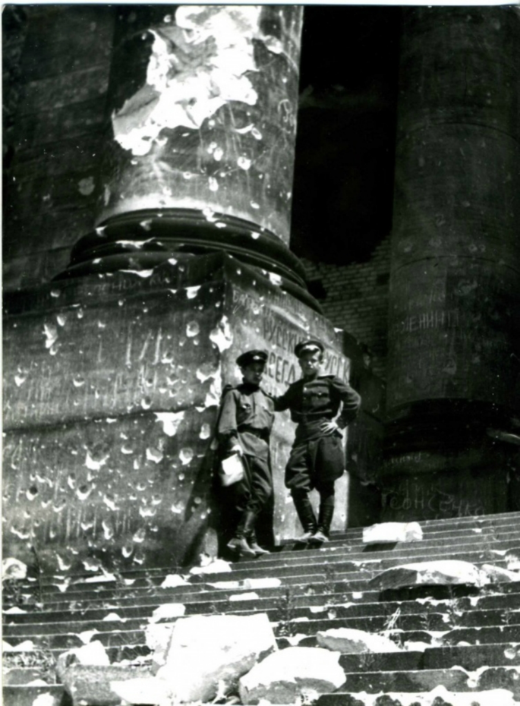 Двое советских офицеров на площади перед зданием Рейхстага.