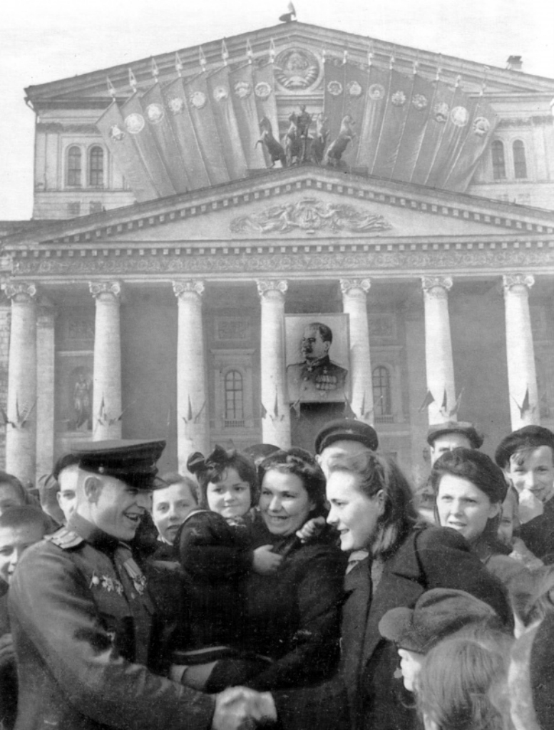 Советские граждане поздравляют офицера с Победой на фоне Большого театра в Москве.
