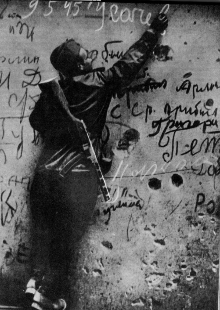 Красноармеец Михаил Усачев оставляет свой автограф на стене Рейхстага.