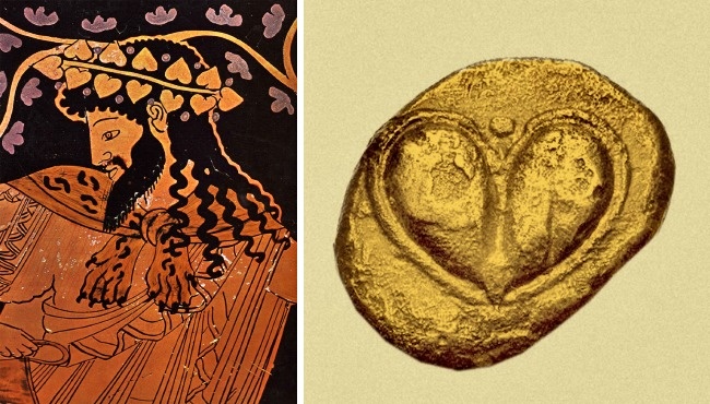 Также есть версия, что данный знак - это форма листика плюща. На вазе у греков он обычно изображался вместе с Дионисом - богом виноделия, покровителем страсти.