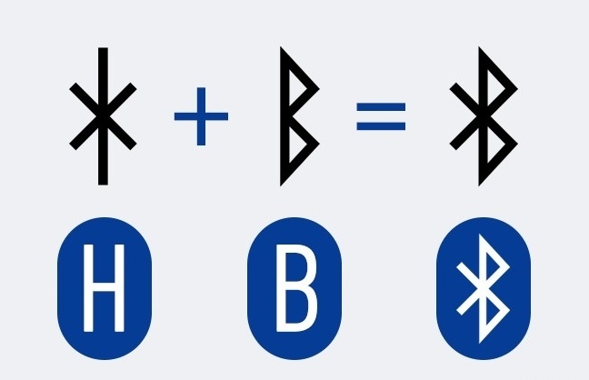 Технология Bluetooth (от англ. "синий зуб") предназначена для объединения нескольких устройств в одну сеть. А знак технологии является сочетанием двух скандинавских рун: "хагал" или "хагалаз" (Hagall) - аналог латинской H, и "беркана" (Berkana) - латинская B, что соответствует первым буквам имени Харальд Блатанд. Кстати, первые устройства, как нетрудно догадаться, были синего цвета и похожими на зуб.