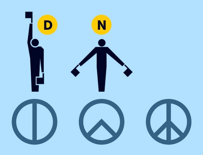 В семафорной азбуке букву N передают, держа два флага в виде перевернутой буквы V, а букву D - один флаг вверх и второй вниз. Эти два сигнала, наложенные друг на друга, образуют форму знака мира.