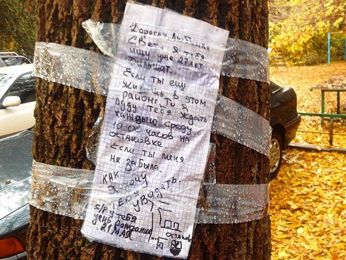 В современном мире поиск людей осуществляется через социальные сети, впрочем как и общение. Уже давно любимые не пишут друг другу писем, не оставляют посланий. А ведь это так приятно - читать оставленную для тебя записку, написанную от руки и от всего сердца. Ее ведь после можно много раз перечитывать, вдыхая запах бумаги и чернил. И неважно, приклеена ли она к дереву или промокла под дождем. Все равно приятно.
