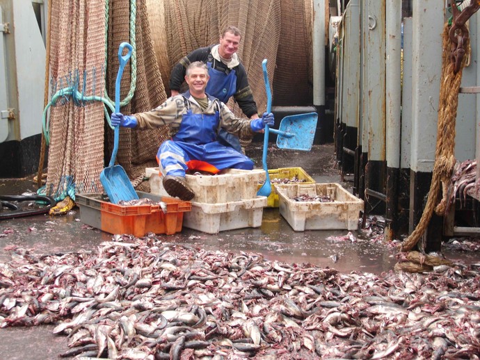 С тралом судно идет почти 7 узлов (почти 14 километров в час). В рубке работают 10 мониторов, которые показывают месторасположение рыбы и ее скорость. Шансов уйти у нее практически нет. За раз улов может достигать 700 тонн.