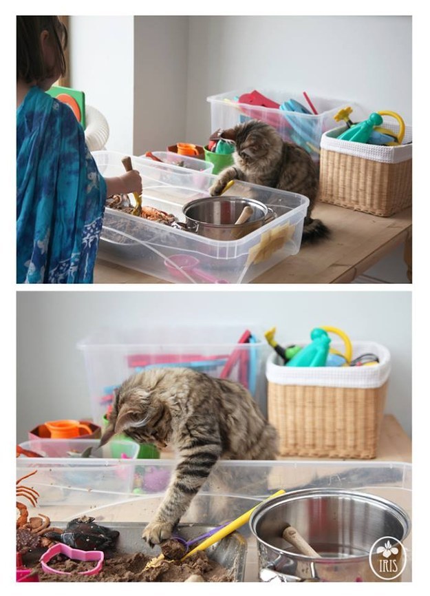 Тула даже помогает маме Ирис в обучении девочки. На фотографии она сидит рядом с песком и формочками.