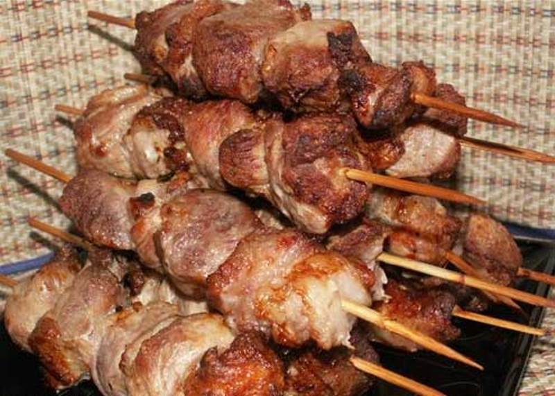 Помыв, разрезав и замариновав мясо, наденьте его на маленькие шпажки, вставляя между кусочками кольца лука и прослойки бекона.