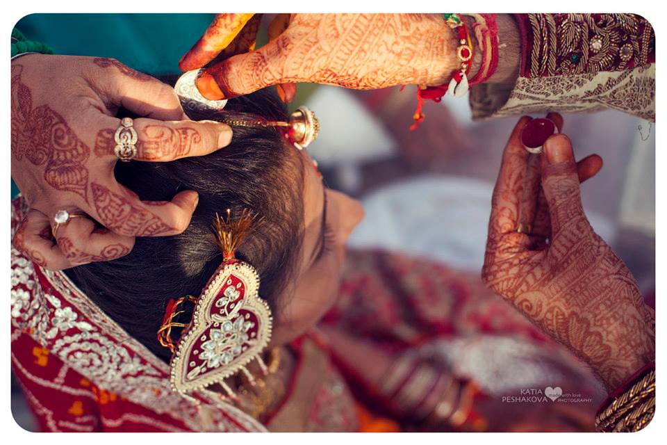 После обхода семи священных кругов (саптапади) вокруг костра, жених наносит своей, теперь уже законной жене, синдур, монетой или кольцом окрашивает ее пробор красным. Теперь она будет это делать сама каждое утро и более тривиальным способом, например помадой.