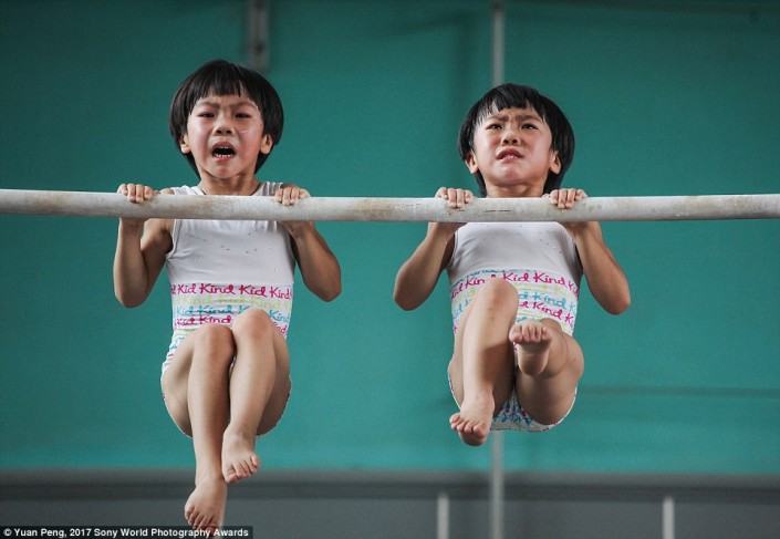 Девочки-близнецы на тренировке по гимнастике в китайской спортивной школе в Цзинине, провинция Шаньдун.