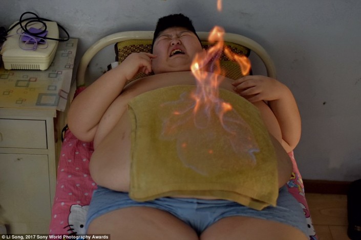11-летний Ли Ханг, страдающий от синдрома Прадера — Вилли, проходит традиционную китайскую процедуру в центре по снижению веса.