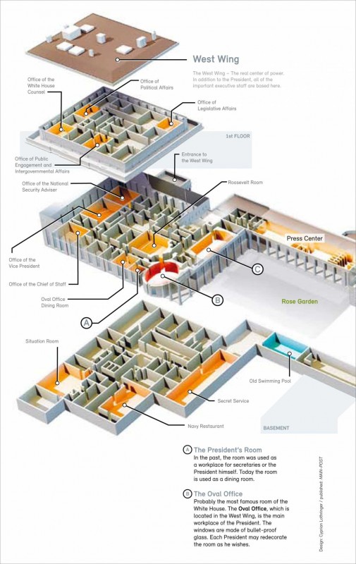 А это внутренняя компоновка Западного крыла, в котором работают президент США и его аппарат. Среди комнат, находящихся в Западном крыле, есть …