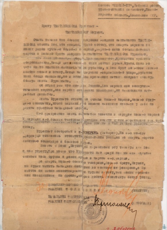 Очень тяжело нам, боевым товарищам гвардии лейтенанта Тастембекова, писать вам это письмо. Трудно потому, что смерть вырвала из наших рядов лучшего боевого товарища, верного сына большевистской партии и вашего брата гвардии лейтенанта Тастембекова Нурахмета.