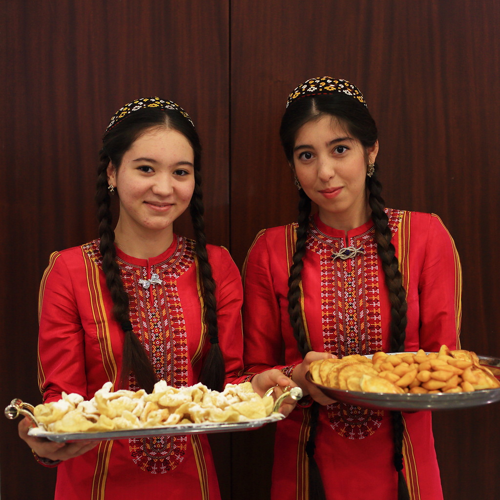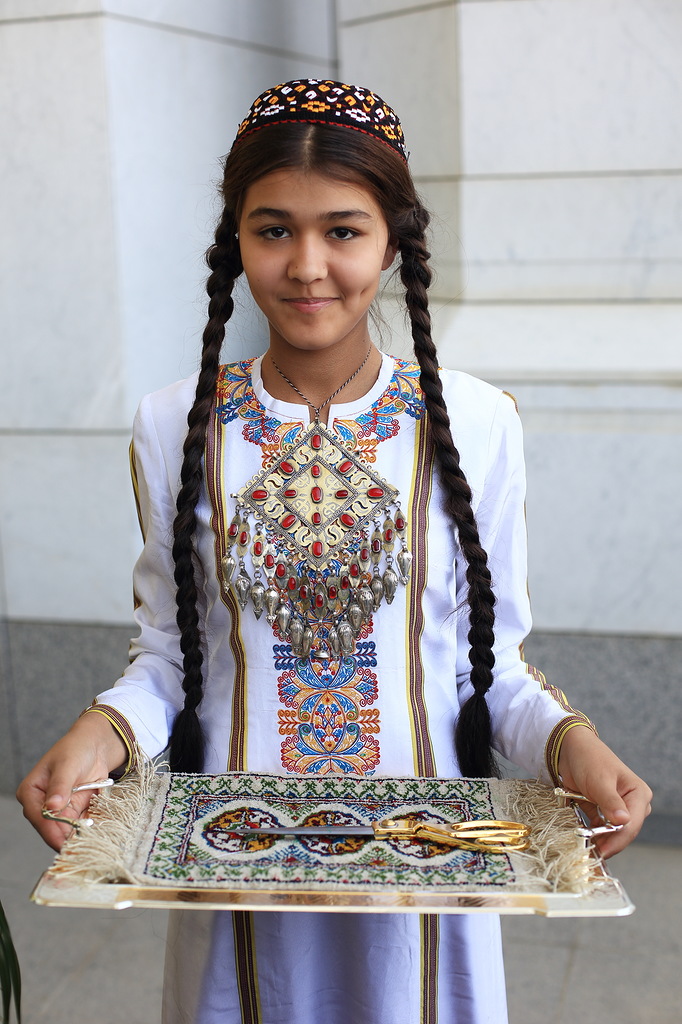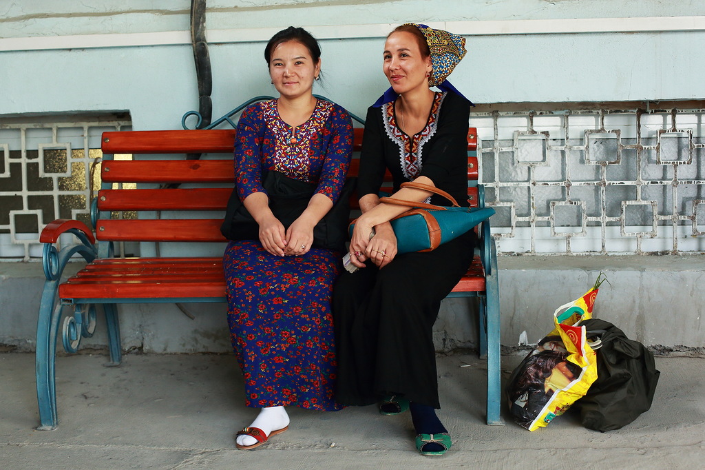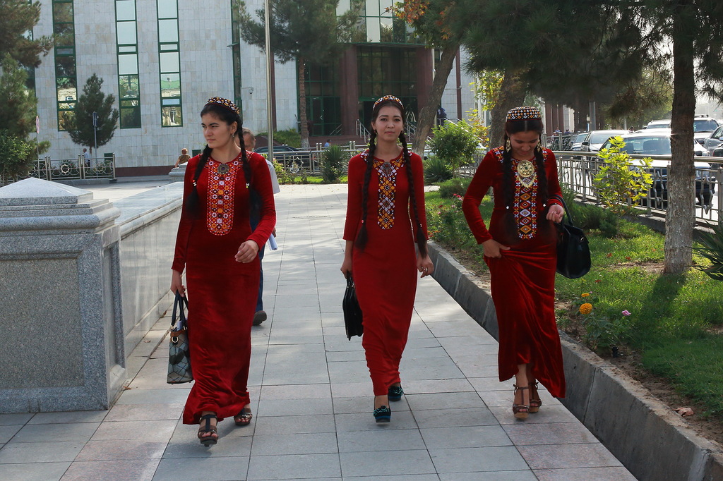 Люди, кстати сказать, очень хорошие, приветливые и открытые. В Ашхабаде почти все говорят по-русски, многие туркмены говорят на чистом русском, даже без признаков акцента. В глубинке русско-говорящих намного меньше, а в селах почти нет. Почти все женщины носят национальные платья. В европейских платьях женщин меньшинство.