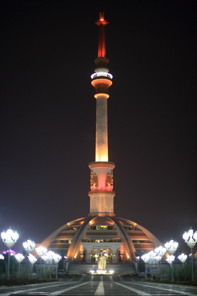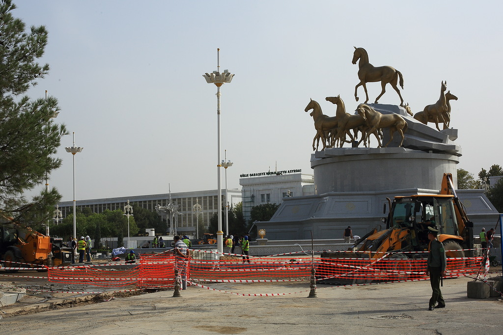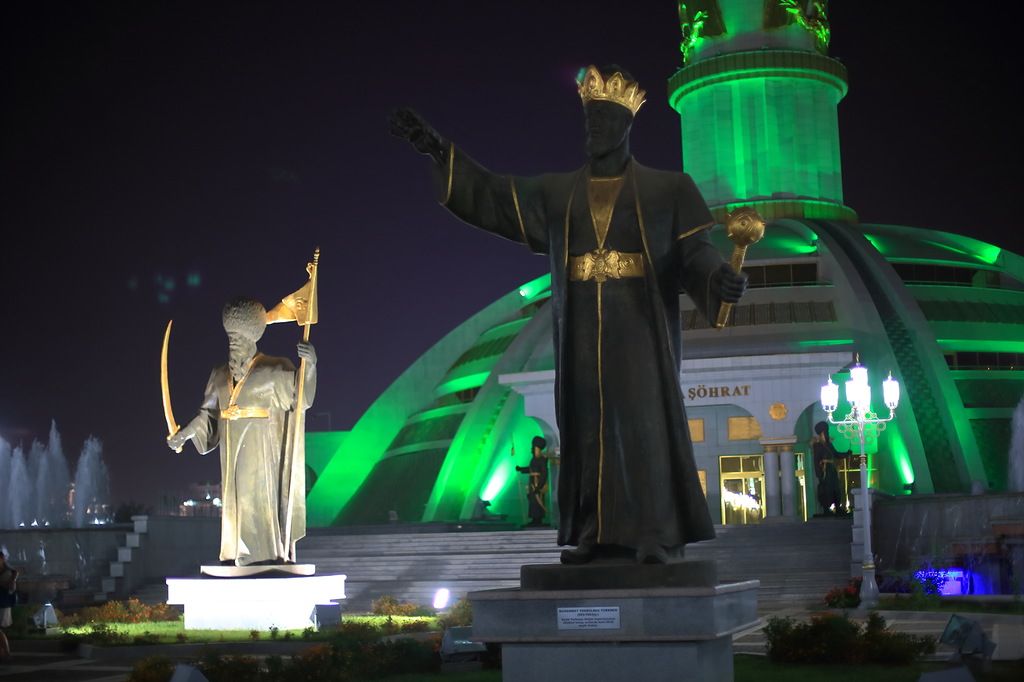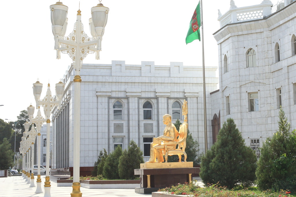 В стране активно борются с культом личности Сапармурата Ниязова Туркменбаши Великого: убрали с улиц десятки тысяч его портретов (сейчас повсюду портреты только нового президента, но его не называют Туркменбаши) и перенесли из центра в новый район главную 14-метровую вращающуюся за солнцем, стоимостью в 10 миллионов долларов скульптуру великого вождя всех туркмен. Все остальные 14 тысяч памятников, скульптур и бюстов, включая многочисленные позолоченные статуи Туркменбаши стоят на своих местах. Фотографировать их категорически запрещено. Снимал тайно, но все равно засекли и посвистели в спину. Хорошо, что хоть не потребовали стереть. Причину запрета на съемку никто не объясняет.