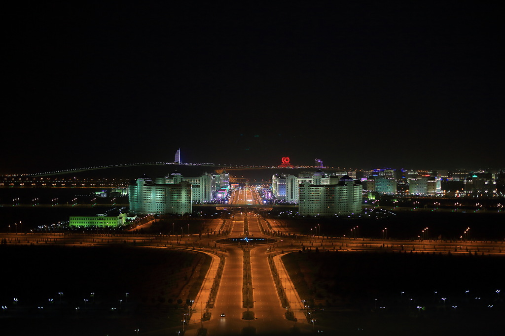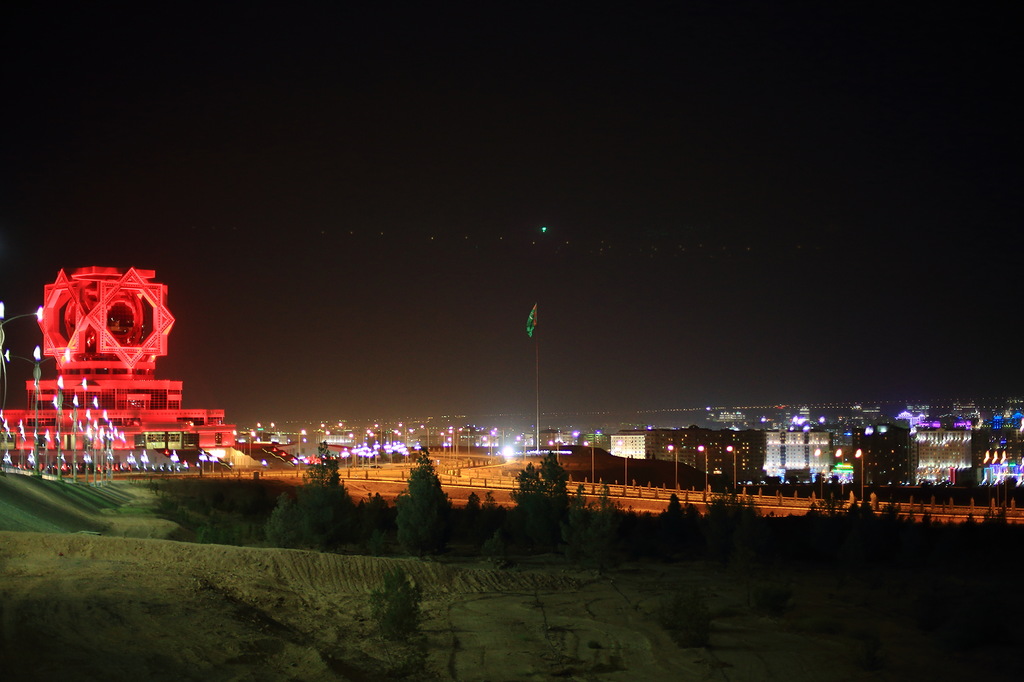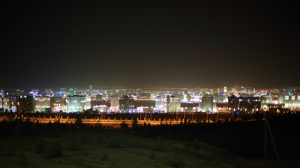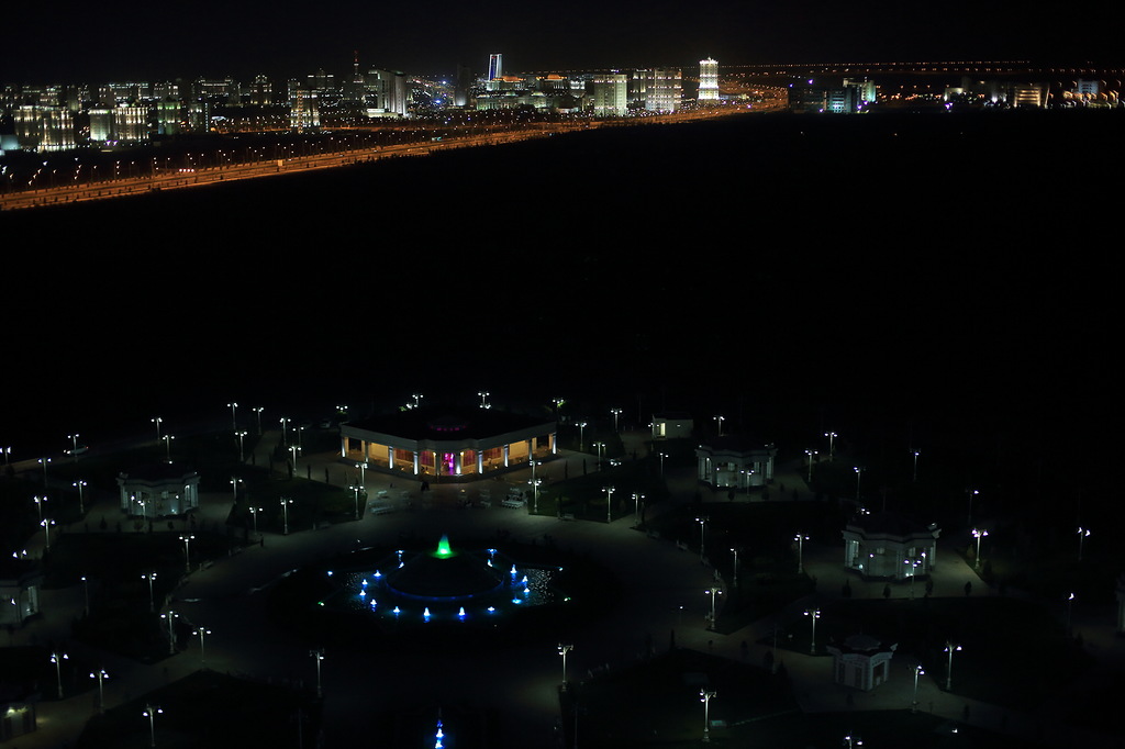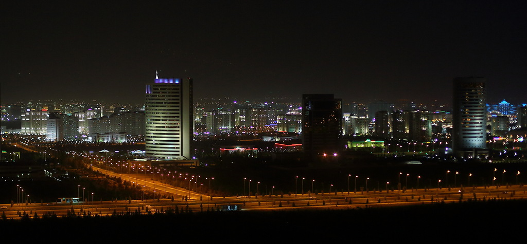 Ашхабад очень красив днем, но еще краше выглядит ночью: все новые здания строятся с подсветкой, многие постоянно меняют свои цвета, все улицы и магистрали хорошо освещены. Рядом с Ашхабадом есть так называемая Тропа здоровья длиной 36 километров. Это обычная бетонная дорожка, бегущая по местным невысоким горам (высшая точка маршрута стоит на высоте 1000 метров). Так вот, даже эта тропа освещается - все желающие могут гулять по ней хоть днем, хоть ночью. На снимке (на горке) два очень красивых здания. Слева (светится фиолетовым цветом) 5-звездный отель похожий на дубайский "Парус", справа (красная подсветка) - дворец бракосочетаний. Обратите внимание, как мало машин на улице, хотя время около семи или восьми вечера.