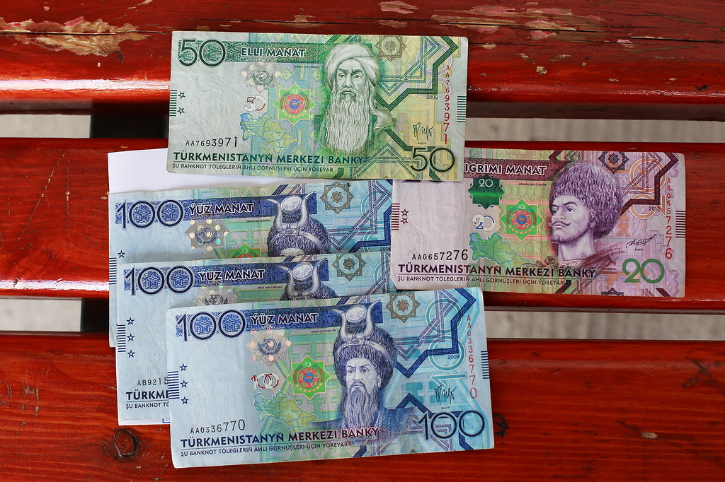 Вот эти пять бумажек я получил в обмен на купюру в 5000 рублей. Курс 13,5 рубля за манат. Рубли обменять можно только в банке, их нигде не принимают. Долларами можно расплатиться почти всюду, даже в обычном гастрономе. Правда, там курс будет довольно грабительский. Доллары в народе уважают и, как правило, сбережения копят именно в долларах или евро. В долг так же дают в иностранной валюте. Чем это вызвано, я не могу понять. Дело в том, что курс у них фиксированный и не менялся уже более 5 лет. Вообще не менялся. Ни на копейку.