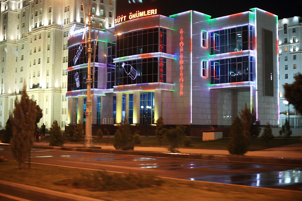 А вот так выглядит обычный продуктовый магазин в новом городе. За ним обычный жилой дом. Снималось вечером, не ночью. Где же народ, спрашиваете вы? - НЕ-ЗНА-Ю! Это самая большая загадка Ашхабада.