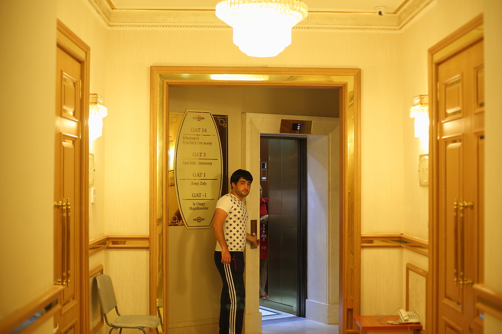 Поднявшись на первый уровень, попадаешь в обычный для Ашхабада интерьер общественных мест - все в золоте. Сотрудник, правда, не во фраке.
