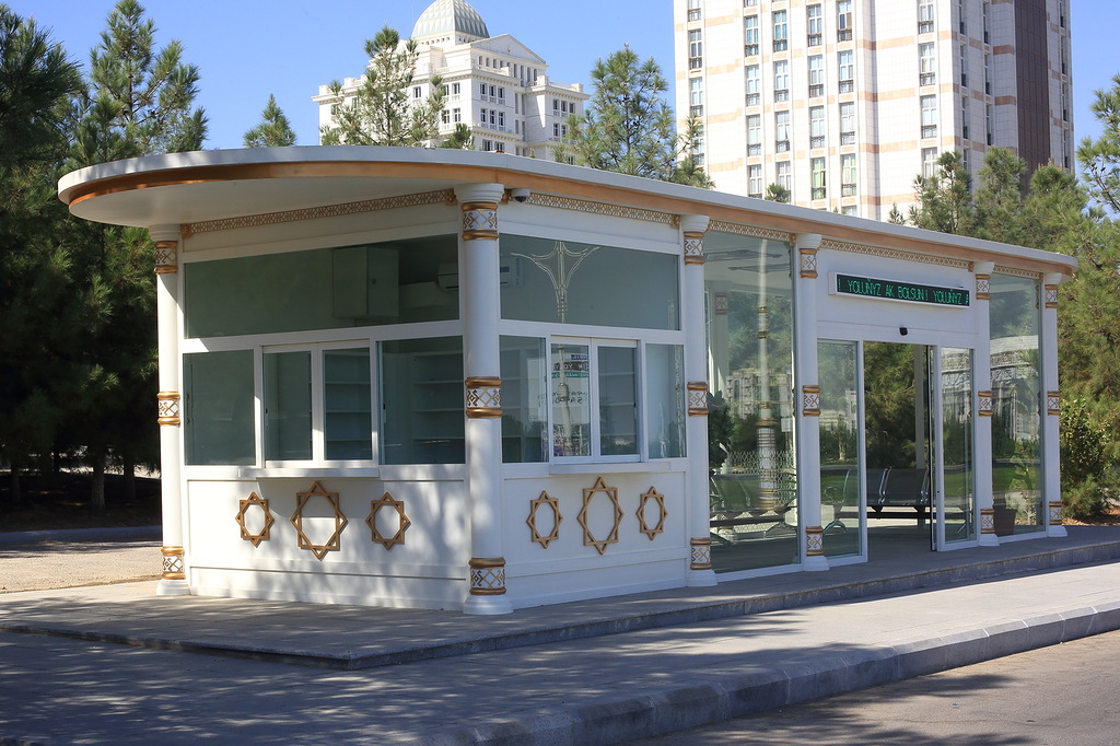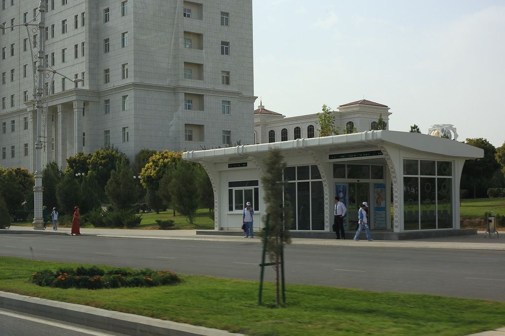 Как жить в таком климате, спросите вы? А вот так: все общественные здания и новые жилые дома строятся только с системой центрального кондиционирования. Нигде не встретится кондиционер на стене дома - все внутри. На фото обычный жилой дом туркменской столицы. Это дом не для элиты. Тут живут самые разные люди, даже дворники. Строение на переднем плане - обычная остановка общественного транспорта. Она так же с кондиционером внутри, огромной плазменной панелью, электронным табло расписания автобуса и цветами в горшках. Обратите внимание на хромированную мусорку справа. Кстати, весь гортранспорт в Туркменистана бесплатен! Сел на автобус и хоть целый день катайся.