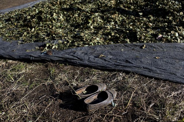 Пара обуви рядом с брезентом, который принадлежит женщине, чья работа заключается в раскидывании листьев коки ногами, чтобы они просушились. Согласно данным ООН, около 99 000 кубических тонн листьев коки собрали в этом районе в 2013 году. В остальных частях Перу этот показатель достигает всего 22 000 тонн.