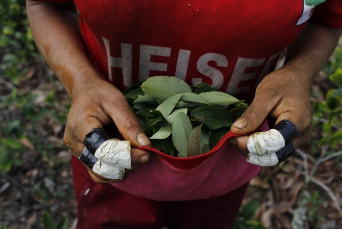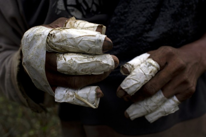 Пальцы рабочего Уолтера Переза перевязаны, чтобы не пораниться во время срезывания листьев коки с веток.