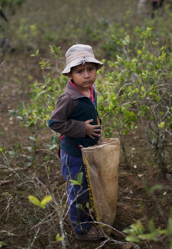 Пятилетний Франко в поле коки помогает своим родителям собирать урожай. Около 17 000 маленьких собирателей коки не ходили в школу уже месяц, потому что учителя бастуют, требуя поднять зарплату с 300 до 581 доллара в месяц.