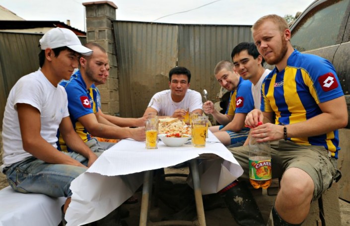 После работы владелец дома накормил волонтеров вкусным пловом.
