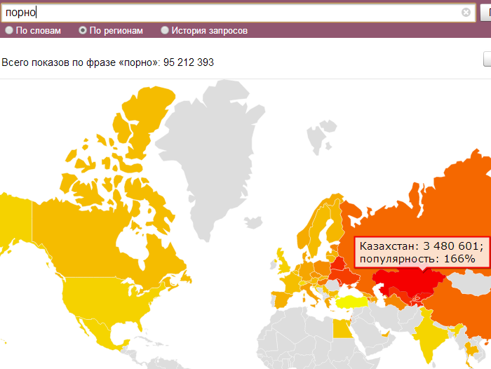 Поисковые системы предлагают множество инструментов для выявления трендов среди населения. Иногда с помощью этих сервисов можно получить достаточно любопытные результаты. Пользователь блог-платформы Yvision с ником Normalny привел статистику по поисковому запросу "порно". В качестве инструмента использовался Wordstat от "Яндекса". Результат показывает, что активнее всего порно ищут именно казахстанцы: