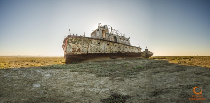 Бывший военный корабль Аральской флотилии, частично порезанный на металлолом. Кладбище кораблей Аралького моря, 2016 год.