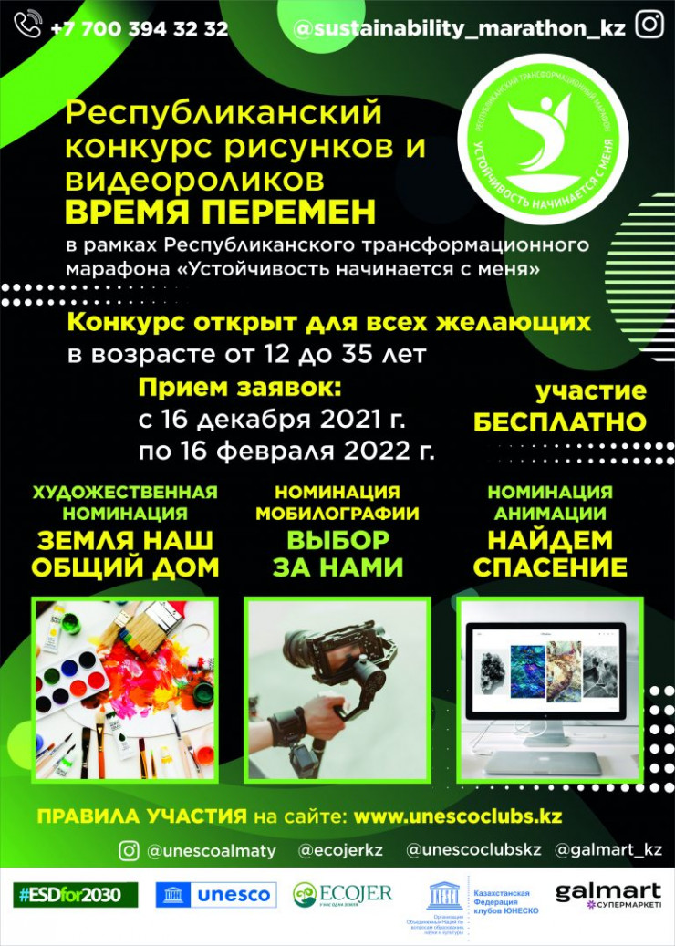 Казахстанская Национальная Федерация Клубов ЮНЕСКО объявила о старте конкурса рисунков и видеороликов "Время перемен" в рамках республиканского трансформационного марафона "Устойчивость начинается с меня", передает TengriMIX.
