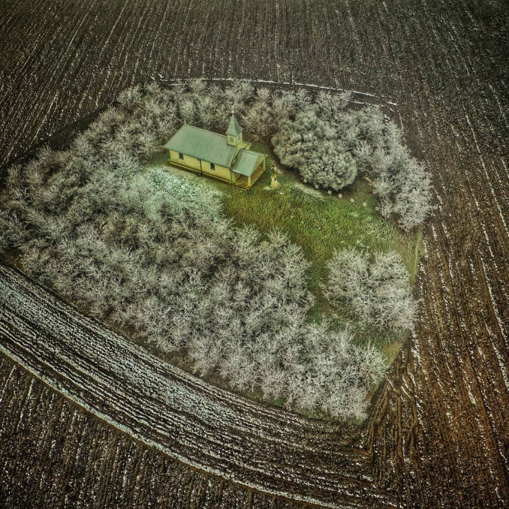 Одинокая церковь посреди сельскохозяйственного поля. 300 лет назад на этом месте была деревня.