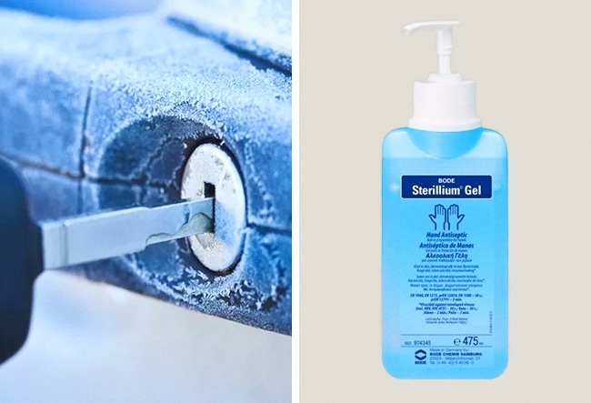 Если замочная скважина уже заледенела, то можно впрыснуть в нее средство для дезинфекции рук и нанести его же на ключ. Тогда все пойдет как по маслу.