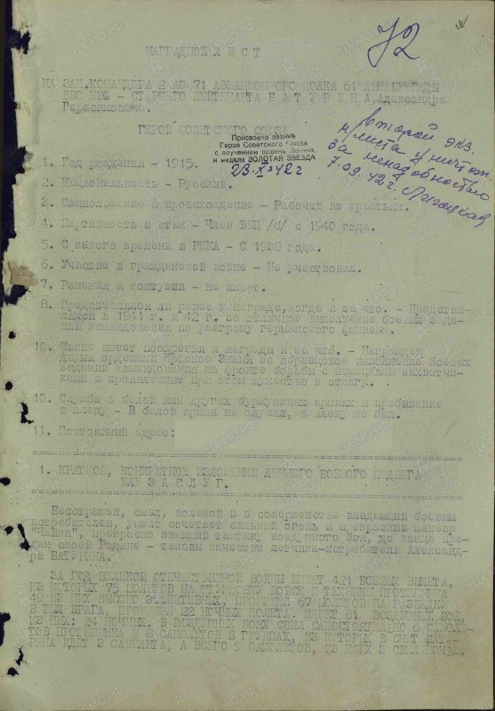 Через три недели Александр сбил еще три самолета, направлявшихся к Ленинграду. Тогда Указом Президиума Верховного Совета СССР от 23 октября 1942 года за образцовое выполнение боевых заданий командования на фронте борьбы с немецкими захватчиками и проявленные при этом мужество и геройство ему присвоено звание Героя Советского Союза с вручением ордена Ленина и медали "Золотая Звезда".