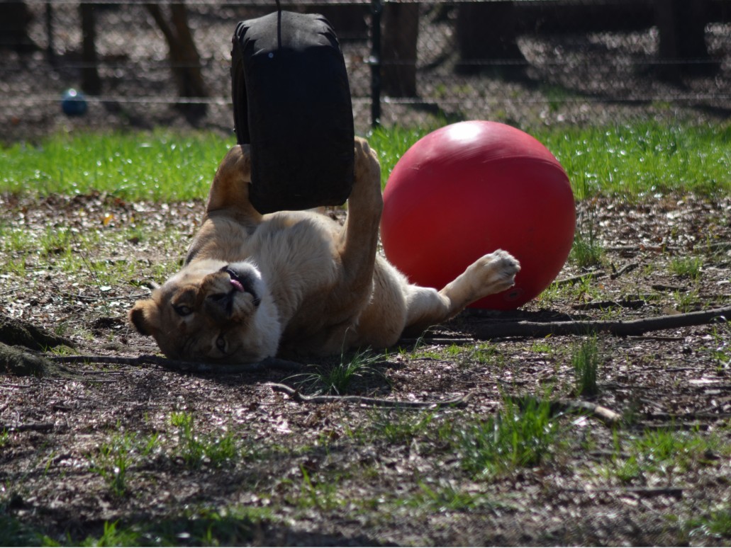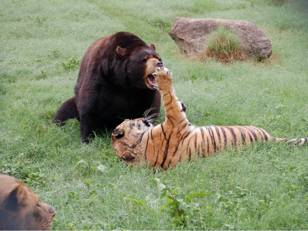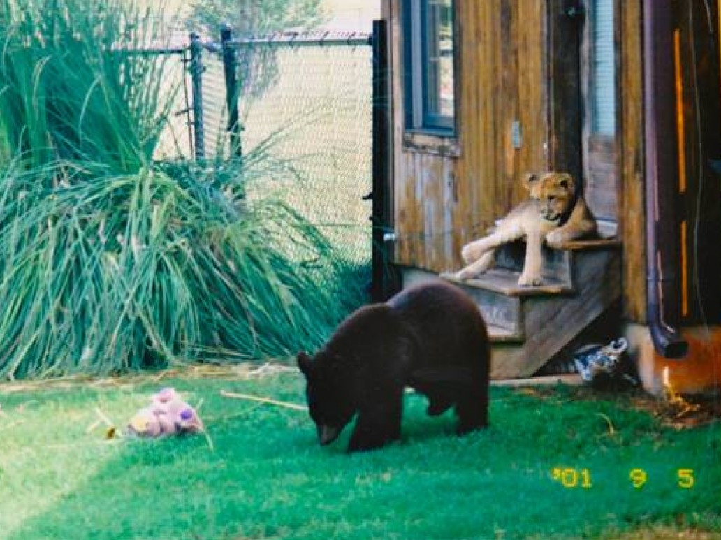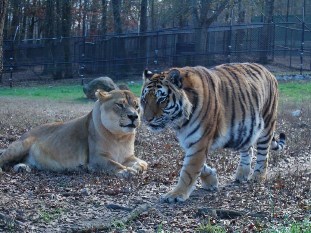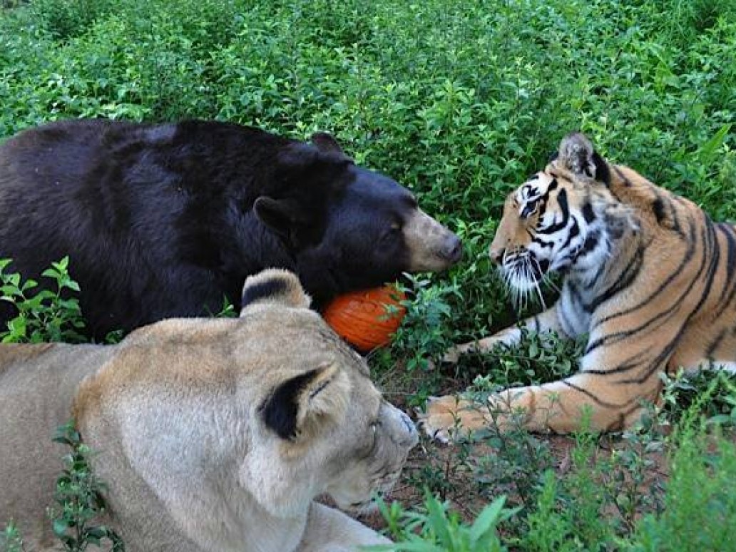 Балу, Лео и Шерхана обнаружили в подвале дома в Атланте, штат Джорджия, во время облавы на притон наркоторговцев в 2001 году. После этого животных, к которым прежние хозяева относились небрежно, поместили под опеку некоммерческой организации помощи диким животным под названием "Ноев ковчег". Когда детенышей вылечили от ран и последствий недоедания, их решили разделить, однако после разлуки все трое вдруг стали вести себя как-то вяло, печально и практически ничего не ели. Тогда их снова поместили в один вольер. Сейчас они живут в вольере площадью чуть больше одного гектара, через который протекает природный ручеек. У них даже есть свой "сельский домик", где лохматое трио любит коротать время. На сегодняшний день - это единственный известный случай, когда три крупных "высших" хищника разных видов живут так близко друг к другу и так дружно. Все трое - самцы и примерно одного возраста. 21 июня "Ноев ковчег" устроил настоящую вечеринку в честь их 13-го дня рождения!