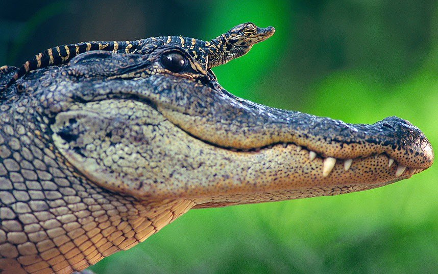 Даже аллигаторы могут быть милыми. Здесь малыш осматривает окрестности с головы своей мамы. Это позволяет ему видеть все, что просходит и быть в безопасности.